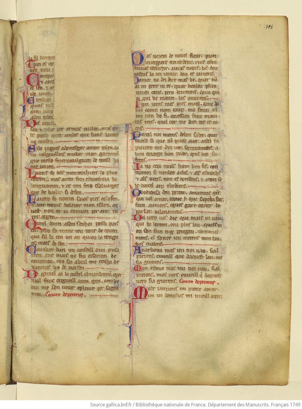 MSS (RUBRICHE): C 231r, (Coms de peytius); E 115 (la rubrica manca, per l'asportazione della vignetta alla p. 116).